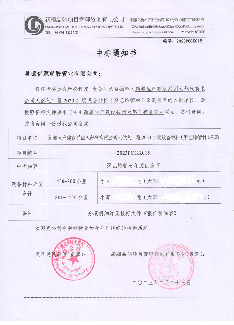 【熱烈慶祝億源管業(yè)成功中標《新疆生產(chǎn)建設(shè)兵團天然氣有限公司天然氣工程2023年度設(shè)備材料(聚乙烯管材)采購項目》】