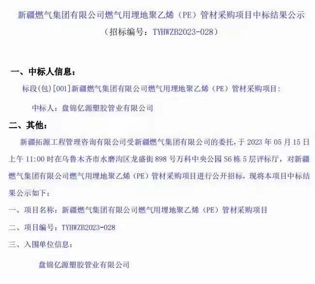 【熱烈慶祝億源管業(yè)成功中標《新疆燃氣集團有限公司燃氣用埋地聚乙烯(PE)管材采購項目》】